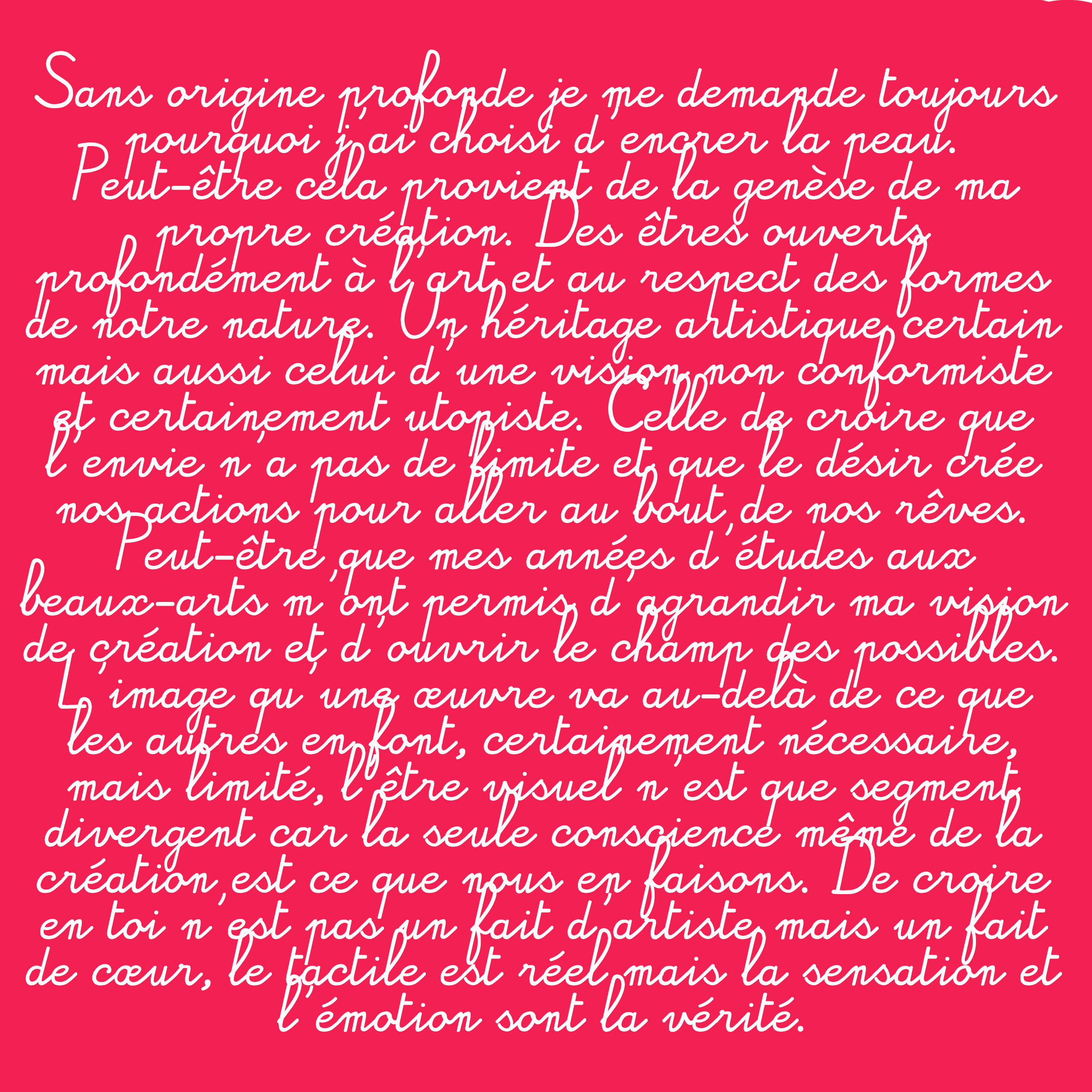 1. Du trait encré dans la peau pour caractériser nos traits, telle est une belle vocation que celle de tatouer le corps, celle de produire aussi. Une voie par laquelle exprimer ce qui est en chacun de nous, ce pour quoi nous sommes voués ou ce que nous pouvons être, avec l’immédiateté du visuel pour en témoigner la force et l’idée que seul le créatif sait faire germer par le dessin. J’apprécie ton regard sur le sens à donner à tout ça, l’originalité de ton témoignage sur ce blog qui s’exprime autant avec des mots couchés au clavier que par le témoignage que laisse ton oeuvre au sens large : tatoos sur la peau, travaux d’illustrations, variétés de supports, coup de crayons par ci et encres diverses sont de rigueur … Je suis tombé par hasard sur ce blog en cherchant le modèle de boussole adéquat pour le tatouage collectif que moi et d’autres projetions, c’est un fait, mais j’admire ton boulot, et par quel moyen tu amènes à en voir le sens, poussée par la détermination, le sens de l’acte, la passion de produire. Inspiré par ton témoignage, que j’ai lu avec tant de bonne humeur, je salue ta reconnaissance pour le désir de créer, et souhaite t’envoyer toute ma reconnaissance pour ton art, plein de vie, plein de nuances, pluri par la variété et non-spécifique à un média, comme j’aime. Cette reconnaissance vaut ce qu’elle vaut, ou presque, en effet, vu que je ne suis qu’un illustre inconnu noyé dans la masse du réseau. T’invitant à prendre ça chaleureusement, je continue ma visite un max impressionné par le challenge que tout artiste relève chaque jour sur les planches, en ce qui concerne les miennes, comme toi, ce sont des planches à dessin, tel que l’on s’y attendait. Espérons que mes encouragements sur cette page sont à la hauteur de tes mots et de ton travail, ceux-là-même qui ont fini par m’inspirer ceux d’à présent, en tout bien tout honneur. Régalons-nous encore de ton portfolio dont j’aurai été ravi de prendre connaissance bien avant de vouloir me faire tatouer. Peace.